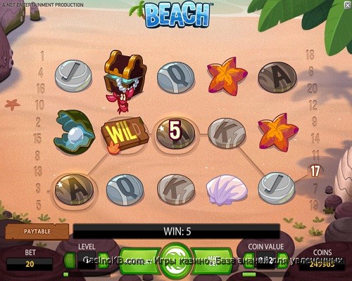 ![]() | Начнем с игрового автомата «Beach» от NetEnt. Это слот на морскую тематику с фирменной приятной графикой и ненавязчивым музыкальным сопровождением. Появление символов язык не поворачивается назвать «вращением», так как они выплывают из моря на песок в прямом смысле слова.